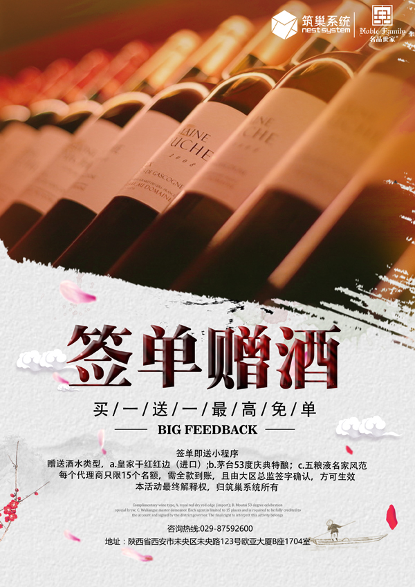 活动内容:活动期间,凡新签筑巢系统超值版一年,加3000元,即可获赠价值6000元酒水一份;