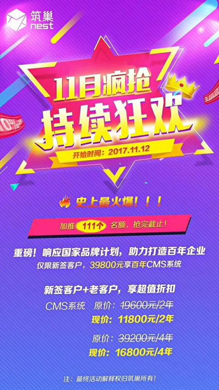 天顺锦合 12.12年末狂欢 错过双11? 还你双12! CMS系统年末狂欢 双重好礼 惠动全国 “惊喜低价+赠送小程序” 活动仅限「15天」 错过只能等2018 了! 1. 筑巢CM…